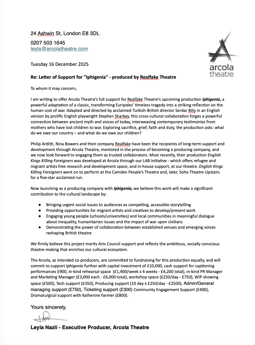 Re: Letter of Support for "Iphigenia" - produced by Realfake Theatre